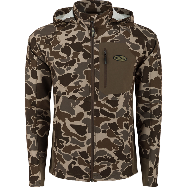 » Stealthy, wind and water-resistant soft-shell exterior» Warm and comfortable coral-fleece lining» Coral-fleece lined front kangaroo style pocket» Anatomical tri-adjust hood» Adjustable draw-cord hem seals...